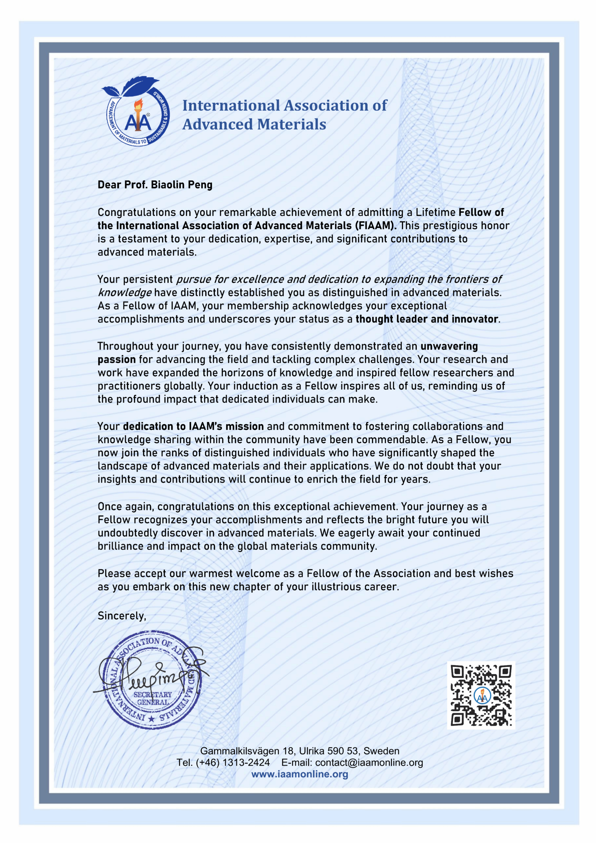 彭彪林教授凭借其在先进功能材料领域的突出贡献,当选为国际先进材料学会终身会士(IAAM Lifetime Fellow)。这一荣誉是对其科研成就的高度认可,也彰显了性爱视频在材料科学领域不断提升的国际影响力。